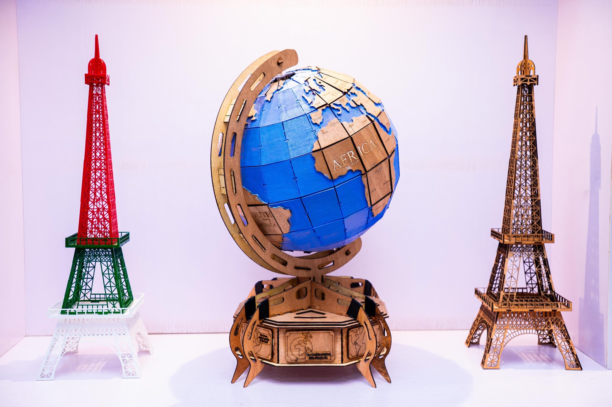 A laser-cut wooden world globe crafted from upcycled wood marries eco-conscious design with intricate craftsmanship, offering a unique, sustainable decorative statement.
