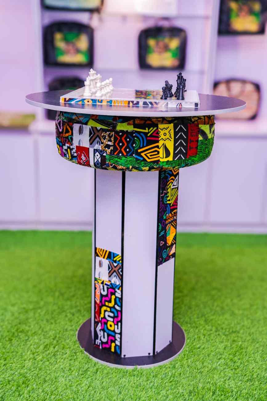 This elevated chess table stands at 3.7 feet and is crafted from a reclaimed tyre and discarded wood, with the surface adorned in vibrant Ankara fabric. The chess pieces, brought to life through 3D printing, blend tradition and technology. The piece celebrates cultural texture, sustainability, and strategic play through innovative reuse of everyday materials.